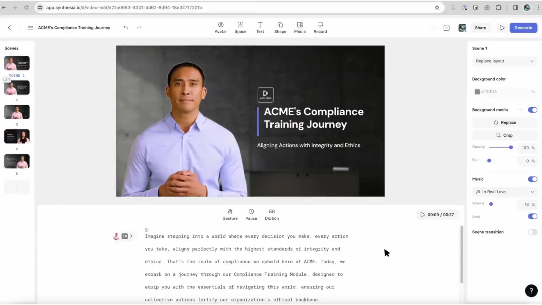 AI videos created with Synthesia allow companies to be agile and consistent in all types of internal communications and training. It is an engaging format that can be easily updated, translated and customised which all in all fosters a more informed, skilled, and motivated workforce, driving the success of the organization's learning initiatives and productivity.