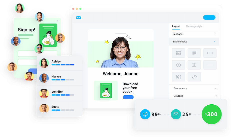 - Collect contacts with signup forms, popups, landing pages, and native integrations.